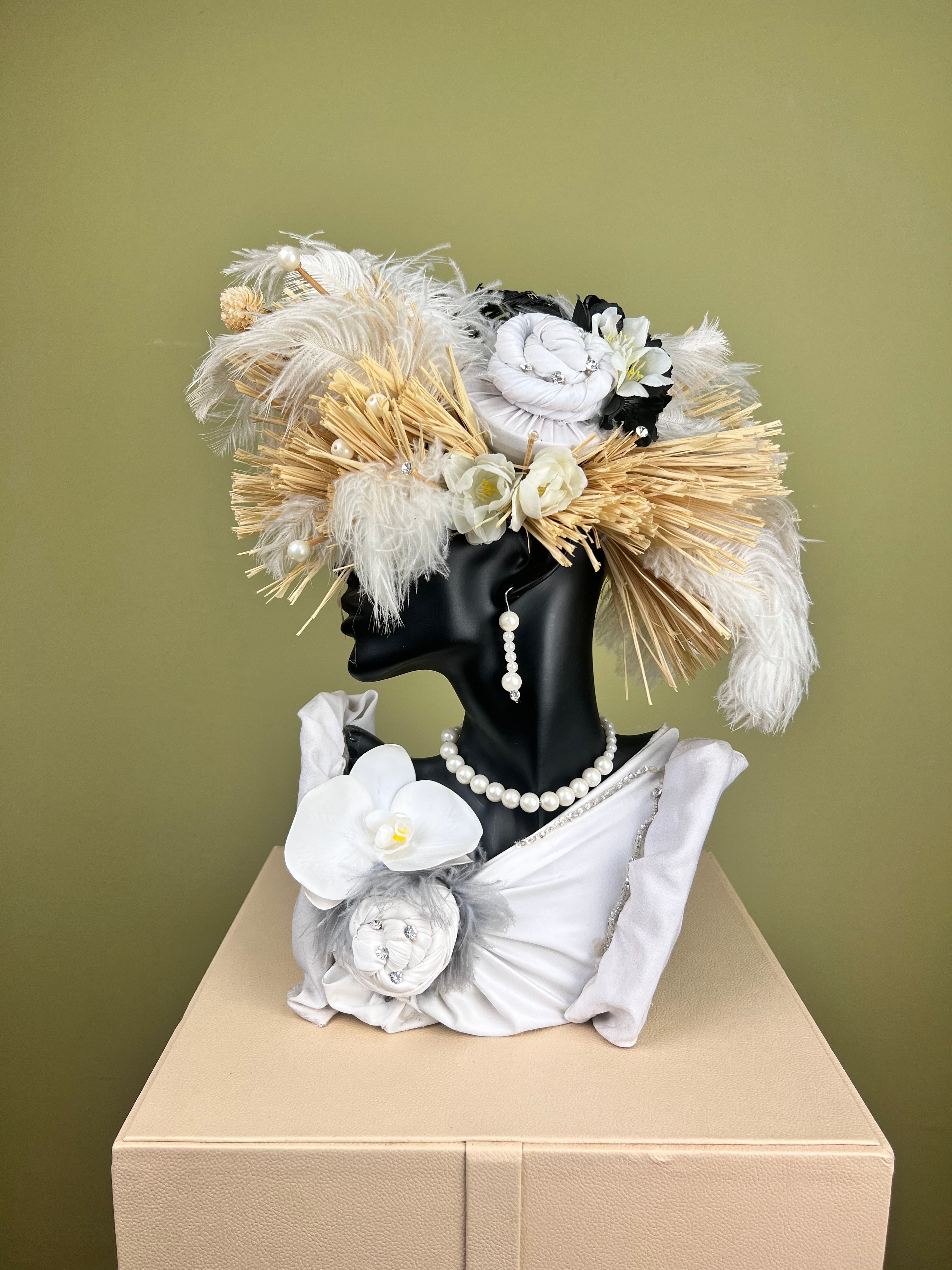 a black mannequin with a headpiece made of dried flowers and grasses. The headpiece is made up of a variety of different types of flowers and grasses, including Feather, pampas grass, and wheat. A touch of nature, a touch of elegance. This beautiful headpiece is perfect for adding a touch of sophistication to any room, office, hall and entrance