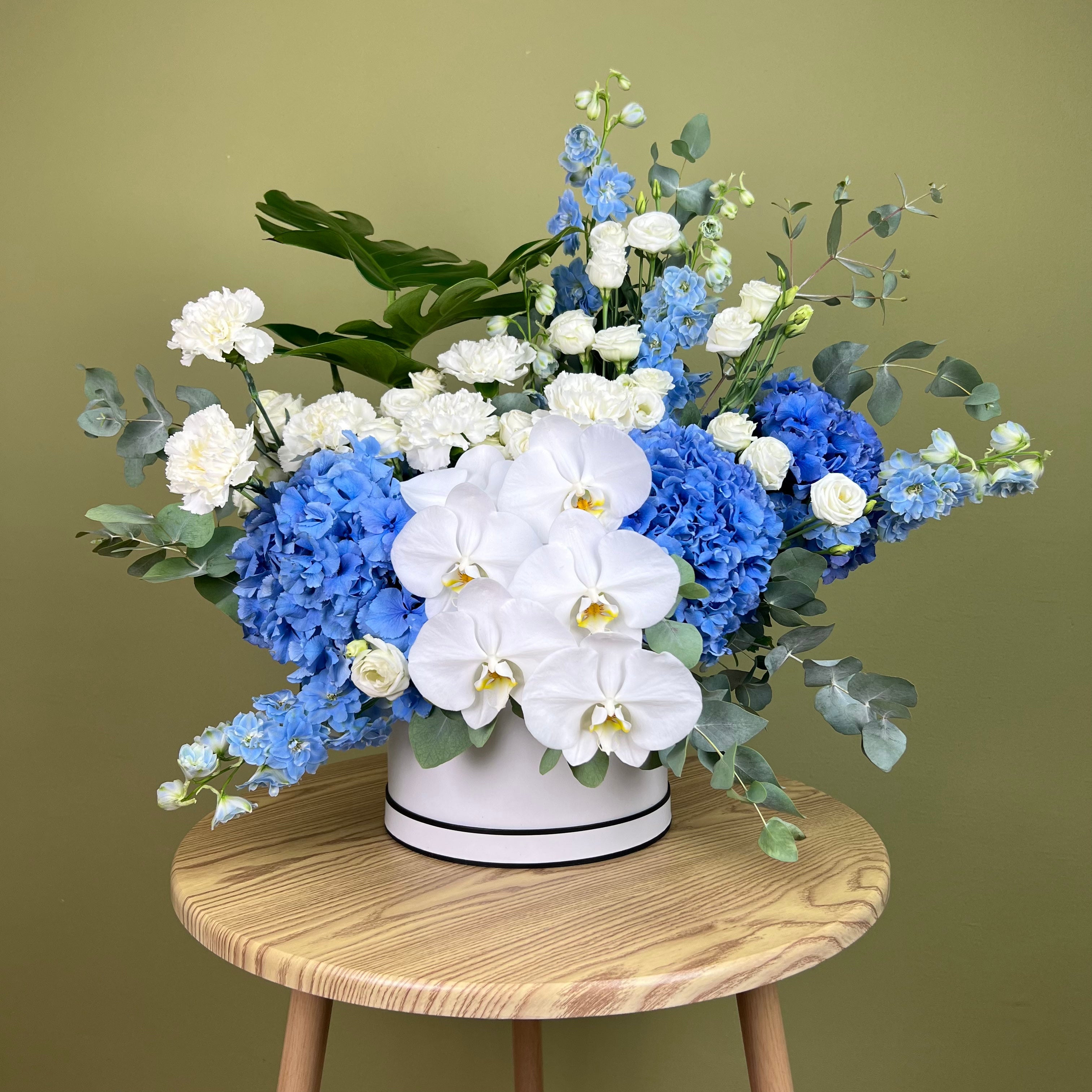 Send Blue Hydrangea, Delphinium, Coronation, Orchid & White Lisianthus Flower Box
