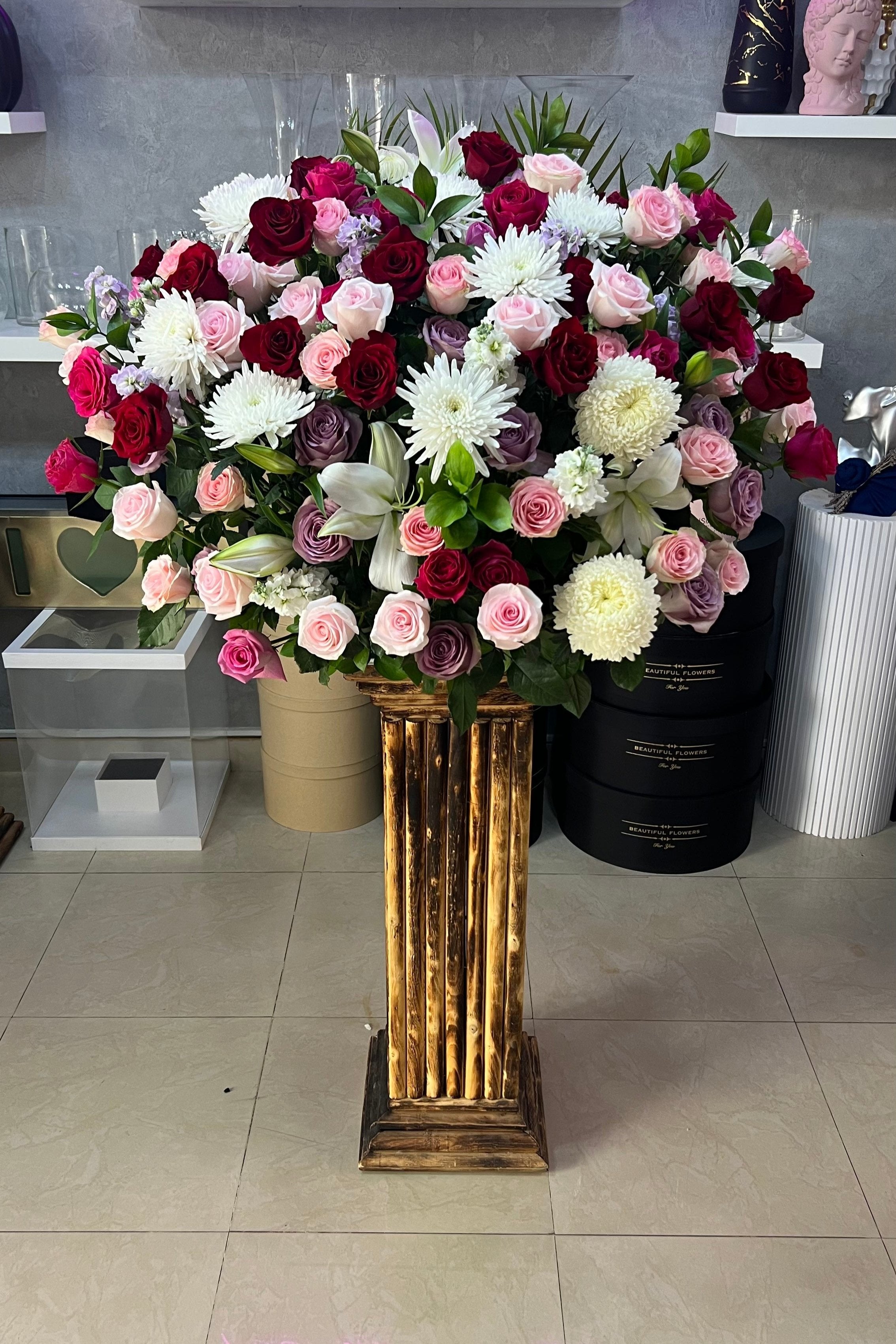 A beautiful floral and large arrangement on a Brown Wood Stand, The arrangement is made up of Mixed Flowers, white lilies, white hydrangeas, and green palm leaves.
