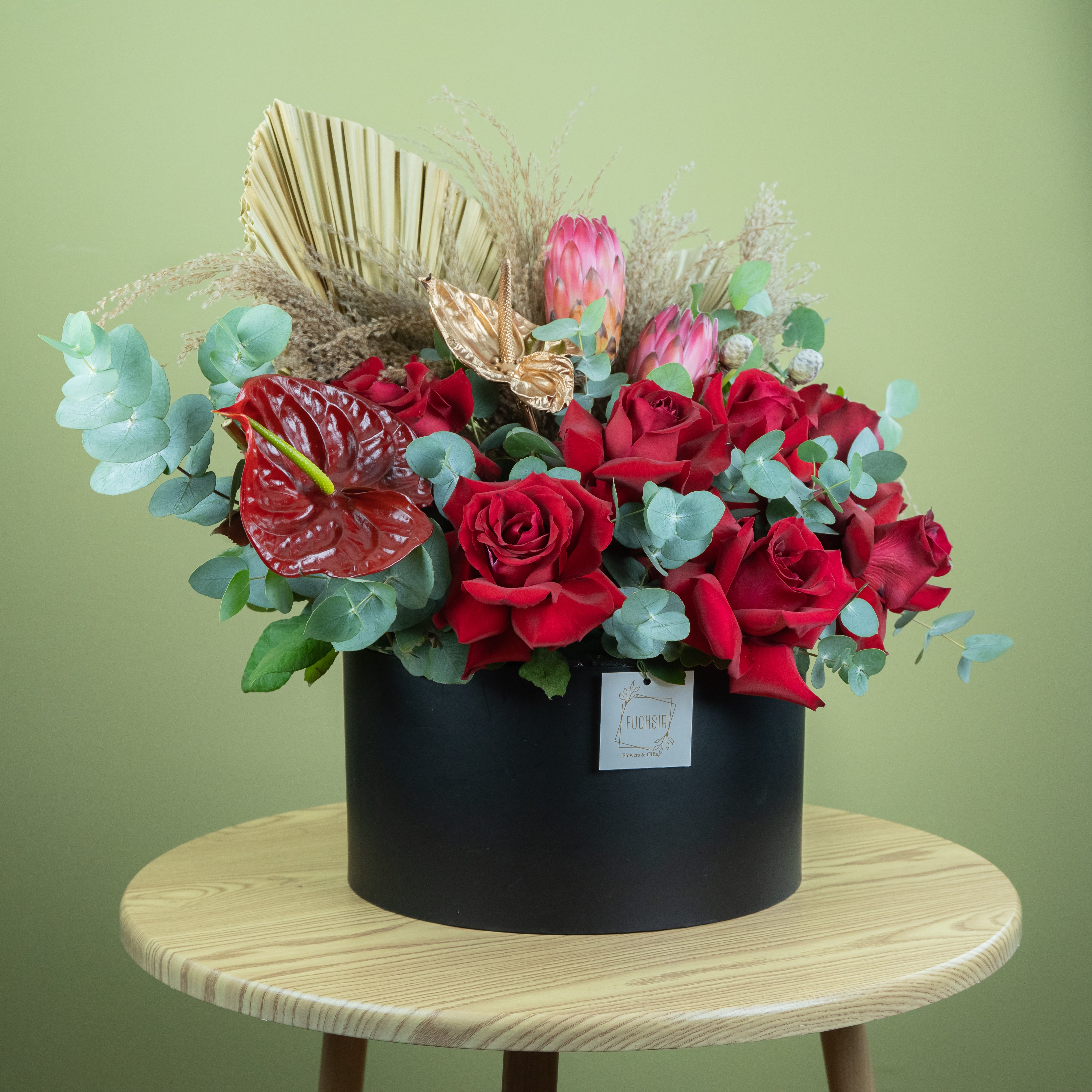 Experience ultimate luxury with DRAGON'S FIRE, featuring a stunning array of RED ROSES, golden and red anthurium, protea flowers, and classic anthurium. Elevate any space with this timeless and elegant arrangement.