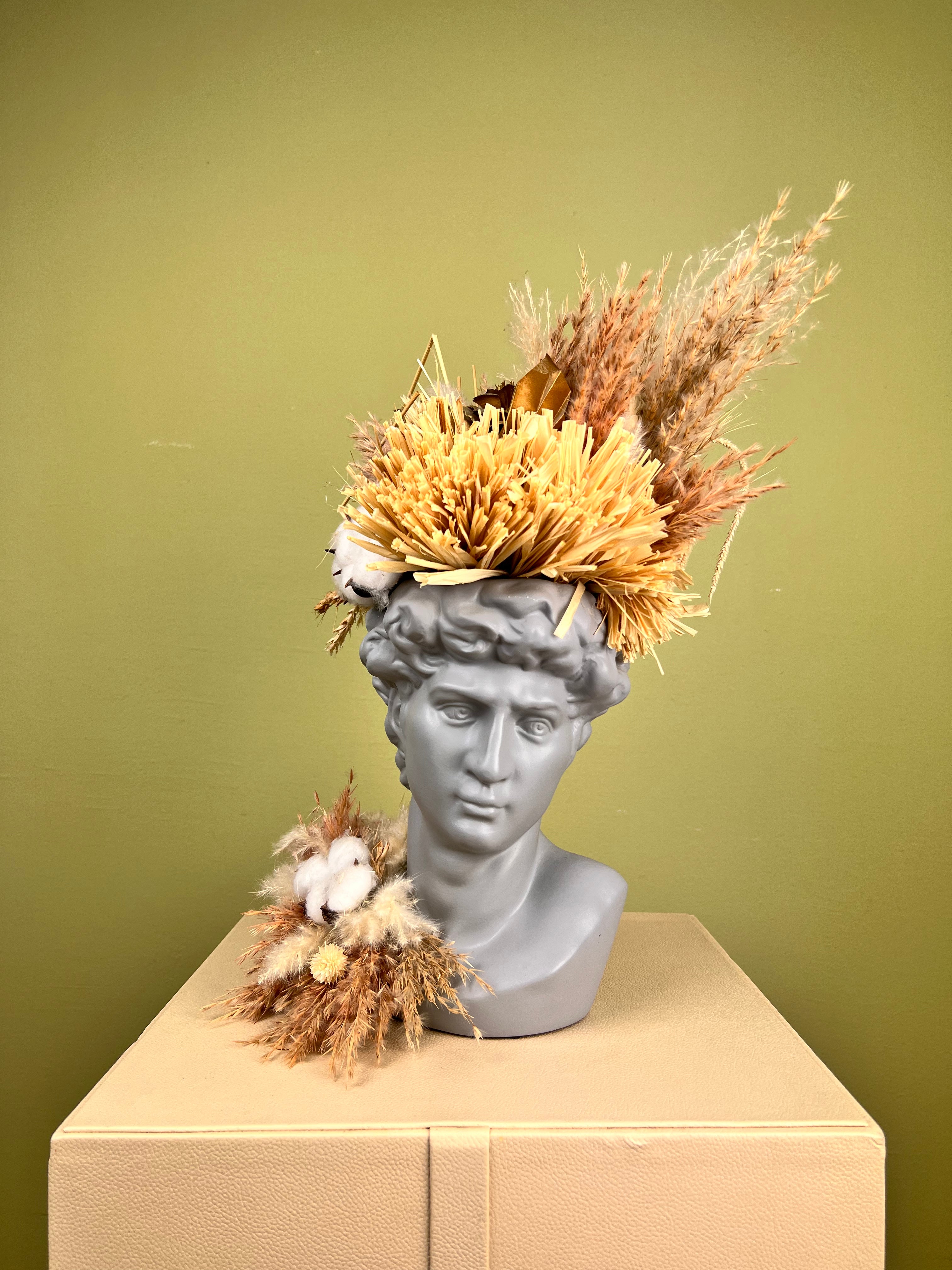 A touch of nature, a touch of history. a gray plaster bust of a man with a headpiece made of dried flowers and grasses. The headpiece is made up of a variety of different types of flowers and grasses, including cotton, pampas grass, and oats .