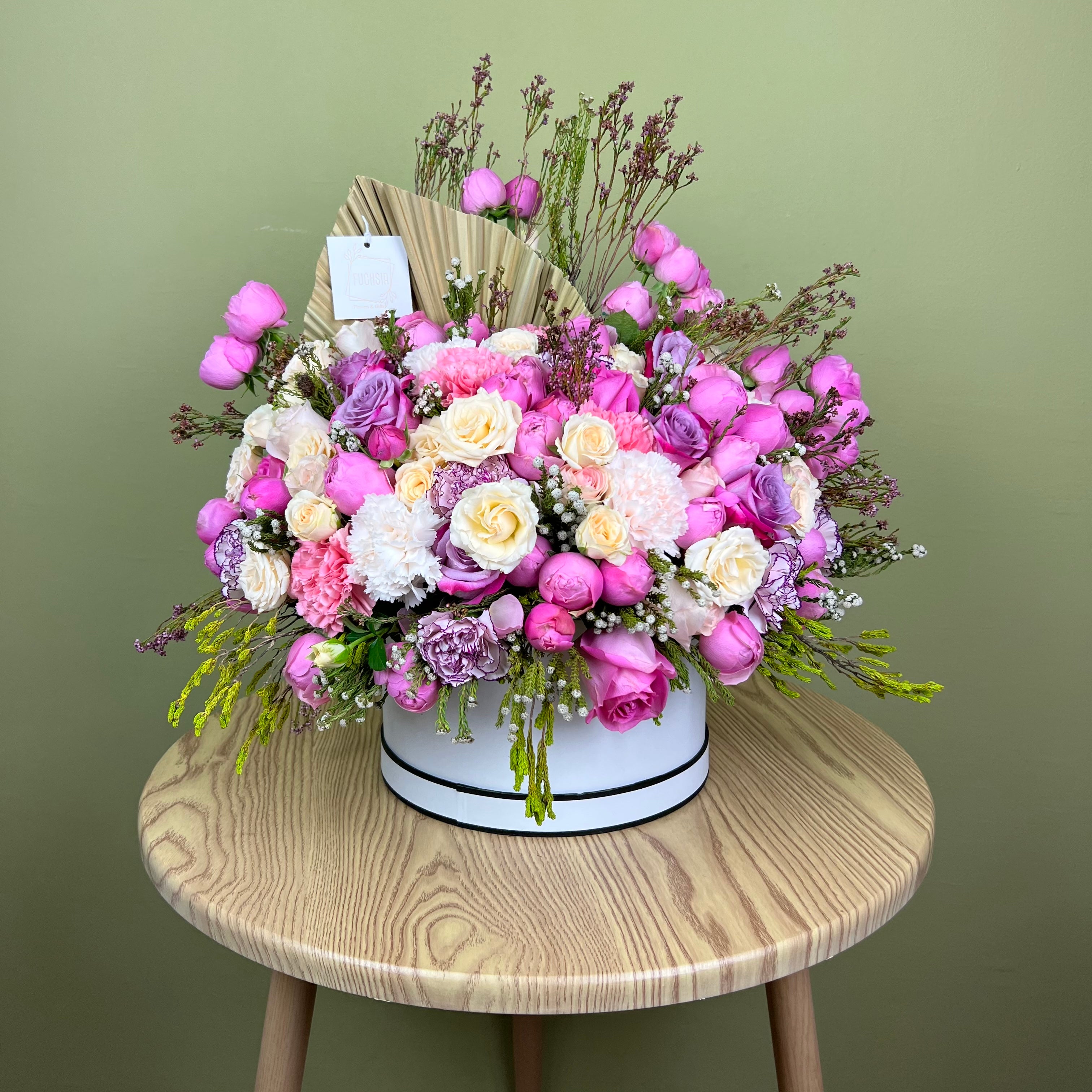 Capture their heart with the "Fancy Spark" bouquet. Overflowing with delicate pink roses, carnations, and other flowers, this stunning arrangement is perfect for any special occasion. The addition of greenery and a few white flowers adds a touch of elegance and sophistication. Express your love and appreciation with Fancy Spark's beautiful bouquet.