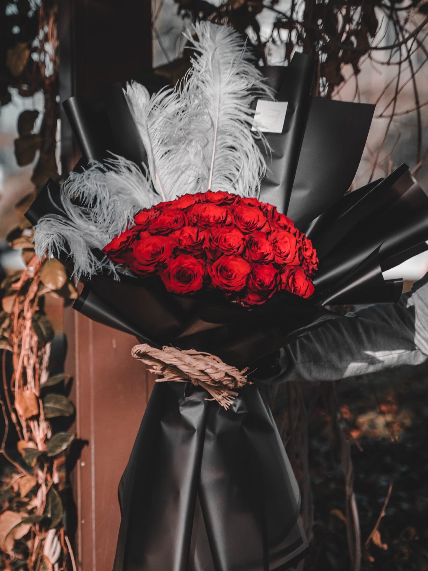 Expertly hand-crafted by our team, these Big Head Red Striking Red Roses feature White Feathers and are elegantly displayed in Black Wrapping.