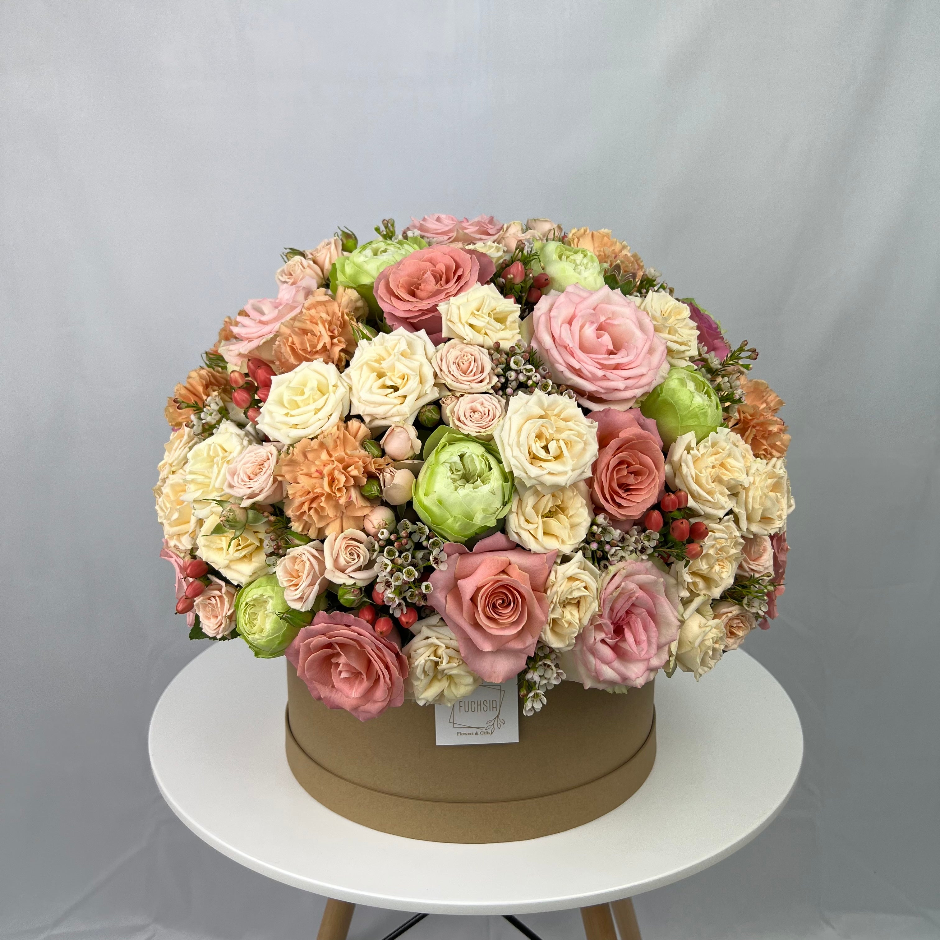 Indulge in a Garden of Delights with this stunning round box filled with a symphony of roses, carnations, and greenery. With hues of peach, blush, and cream, this bouquet exudes warmth and joy, making it the perfect expression of love and appreciation. Expertly crafted for an unforgettable experience.