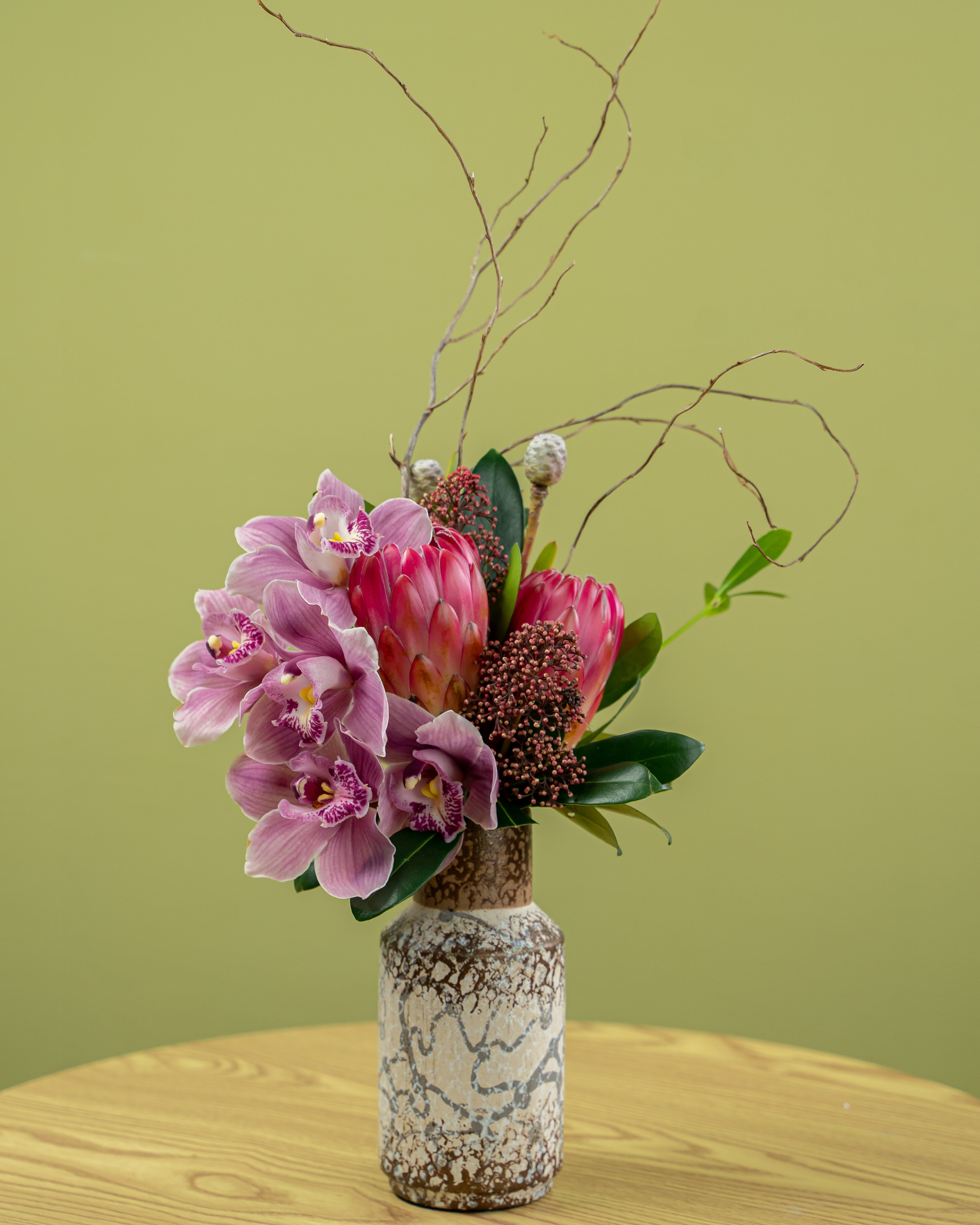 Expertly crafted ceramic vase with a stunning arrangement of protea, cymbidium, and red skeme flowers. Perfect for adding a touch of elegance to any space. Exceptional quality and design.
