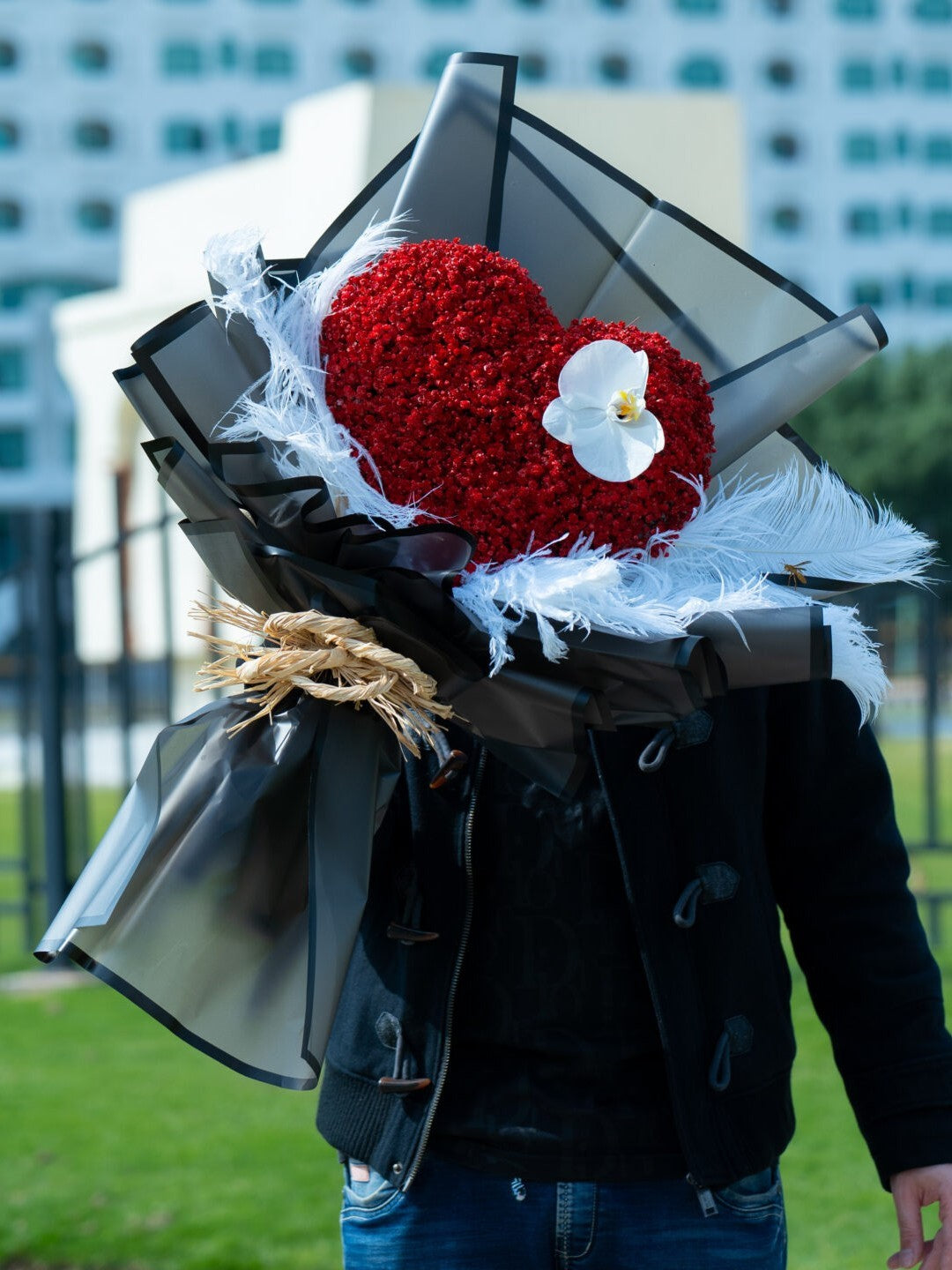 The Gypso Bouquet features stunning shades of red and accents of white orchids and delicate feathers, all elegantly wrapped in a sleek black packaging.