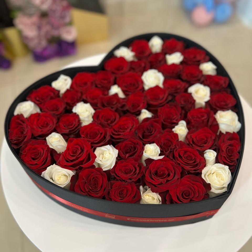 Our classic heart-shaped box comes in ANY ROSE color .