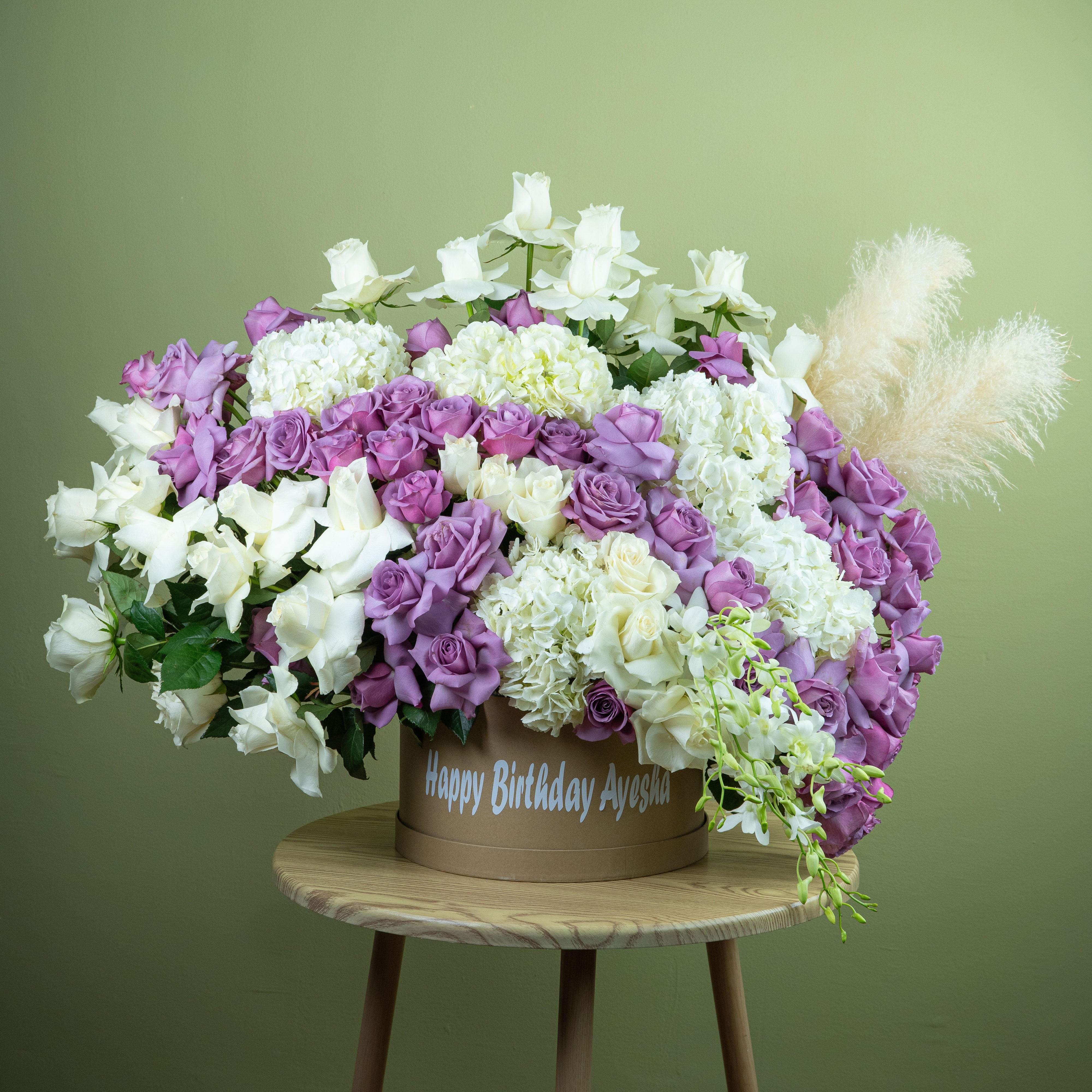 The Gloom Haven is a massive & grandiose gift, overflowing with large head white roses, hydrangea, white orchid and vibrant purple roses. The impressive size of this arrangement will require a spacious vehicle for delivery. Perfect for a birthday gift and other occasions .