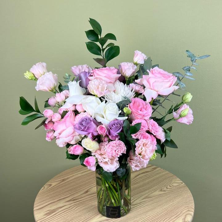 Indulge in the "Pastel Paradise" bouquet, a breathtaking display of pastel-colored flowers that exude elegance and romance. The delicate pink and white roses, purple lisianthus, and pink carnations, paired with lush greenery, make it a perfect choice for any special occasion.