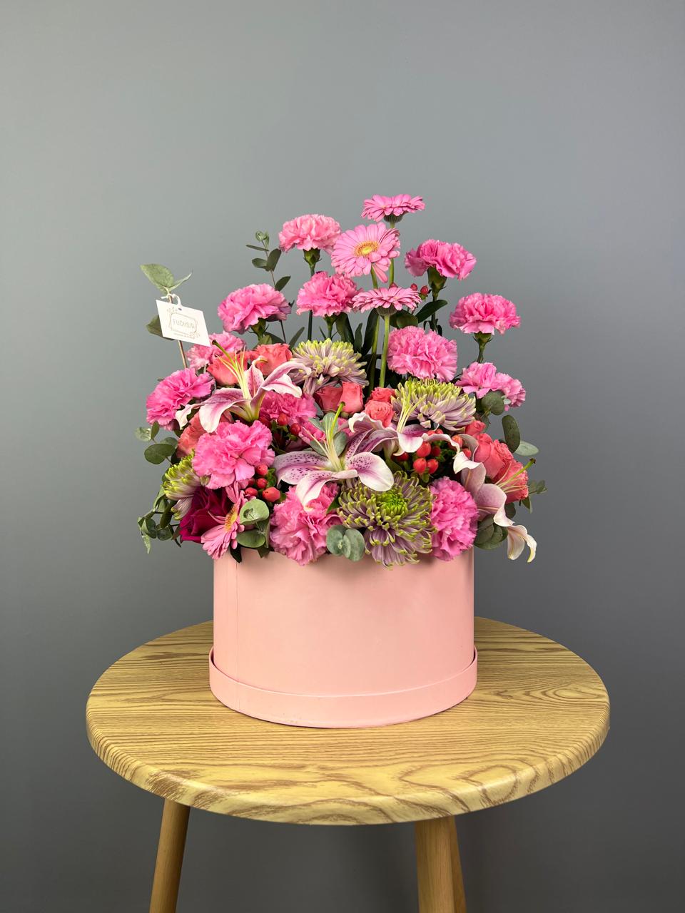 This stunning bouquet features a variety of pink flowers, such as delicate pink carnations and pink gerbera daisies, along with white lilies and green hydrangeas. The arrangement is modern and stylish, making it the perfect choice for any special occasion. With its beautiful presentation in a pink hatbox, this bouquet is sure to make a lasting impression.