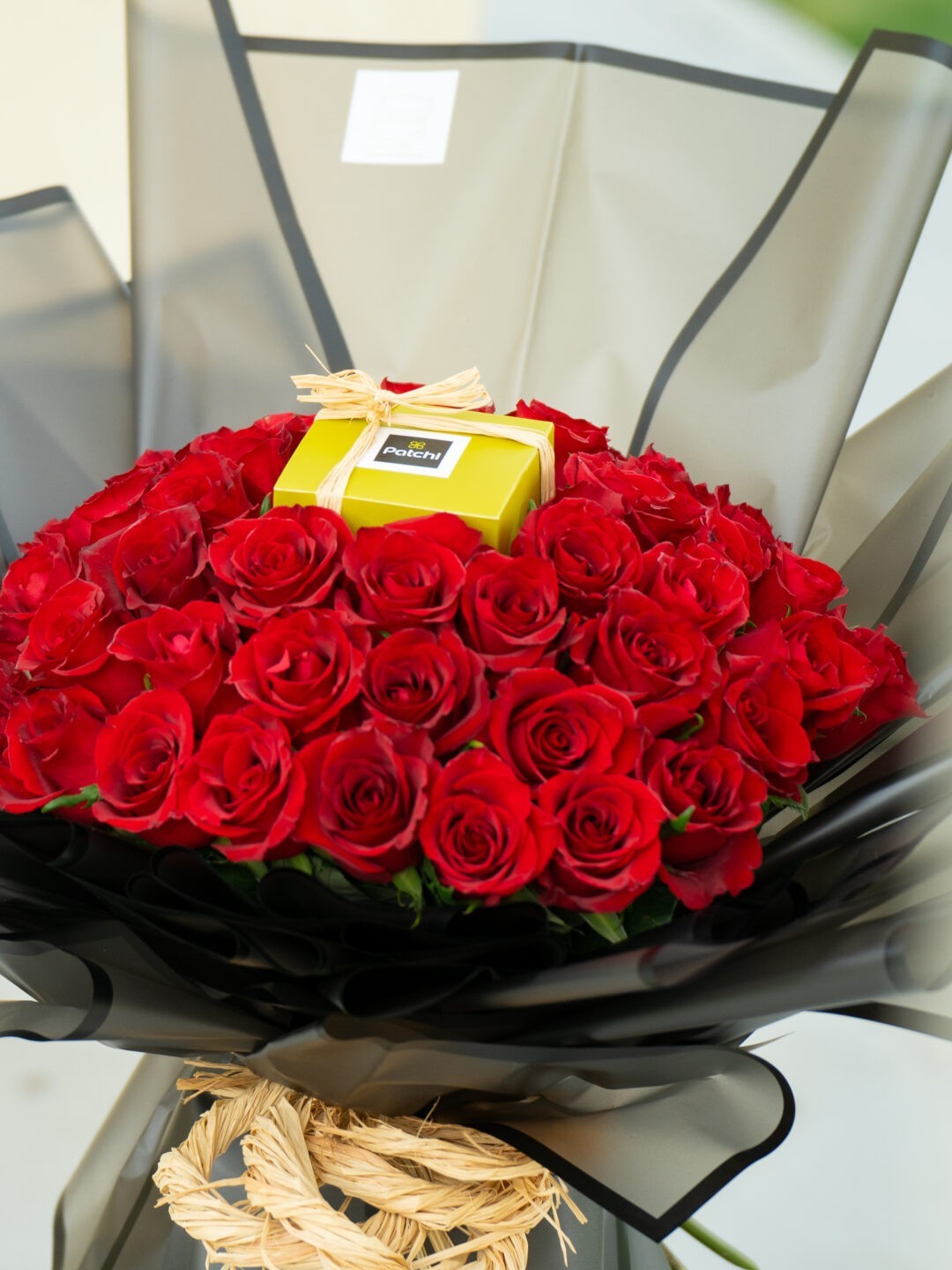 Crafted by our skilled team, these 51 red Roses boast large heads and are elegantly presented in Black Wrapping, accompanied by delectable Patchi Chocolate.