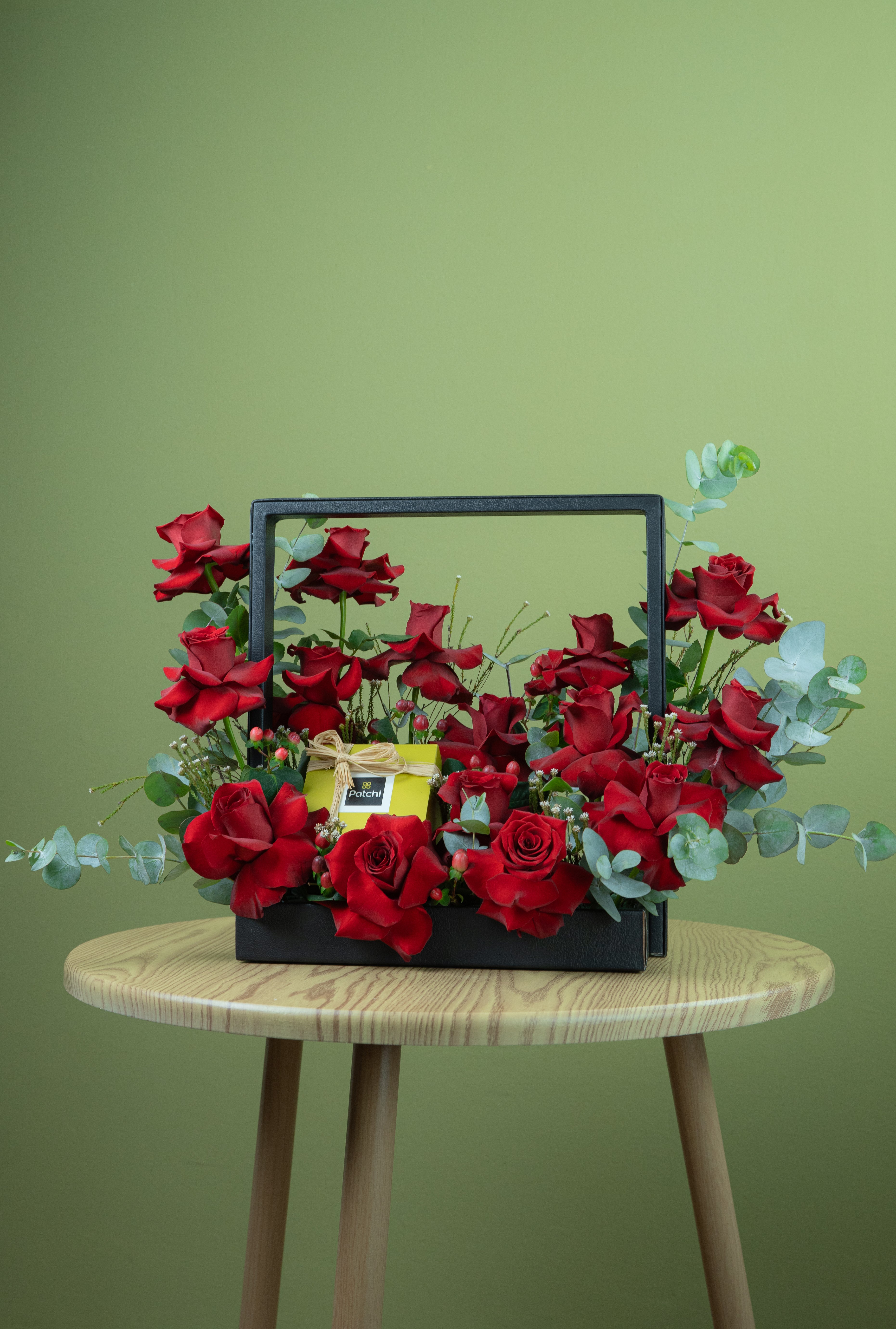 Introducing our Red Vibrant arrangement With Patchi chocolate. This stunning arrangement boasts a striking red color and is made with love and care. Enhance your gift with this vibrant addition to your lover. Experience the benefits of premium material and bold colors