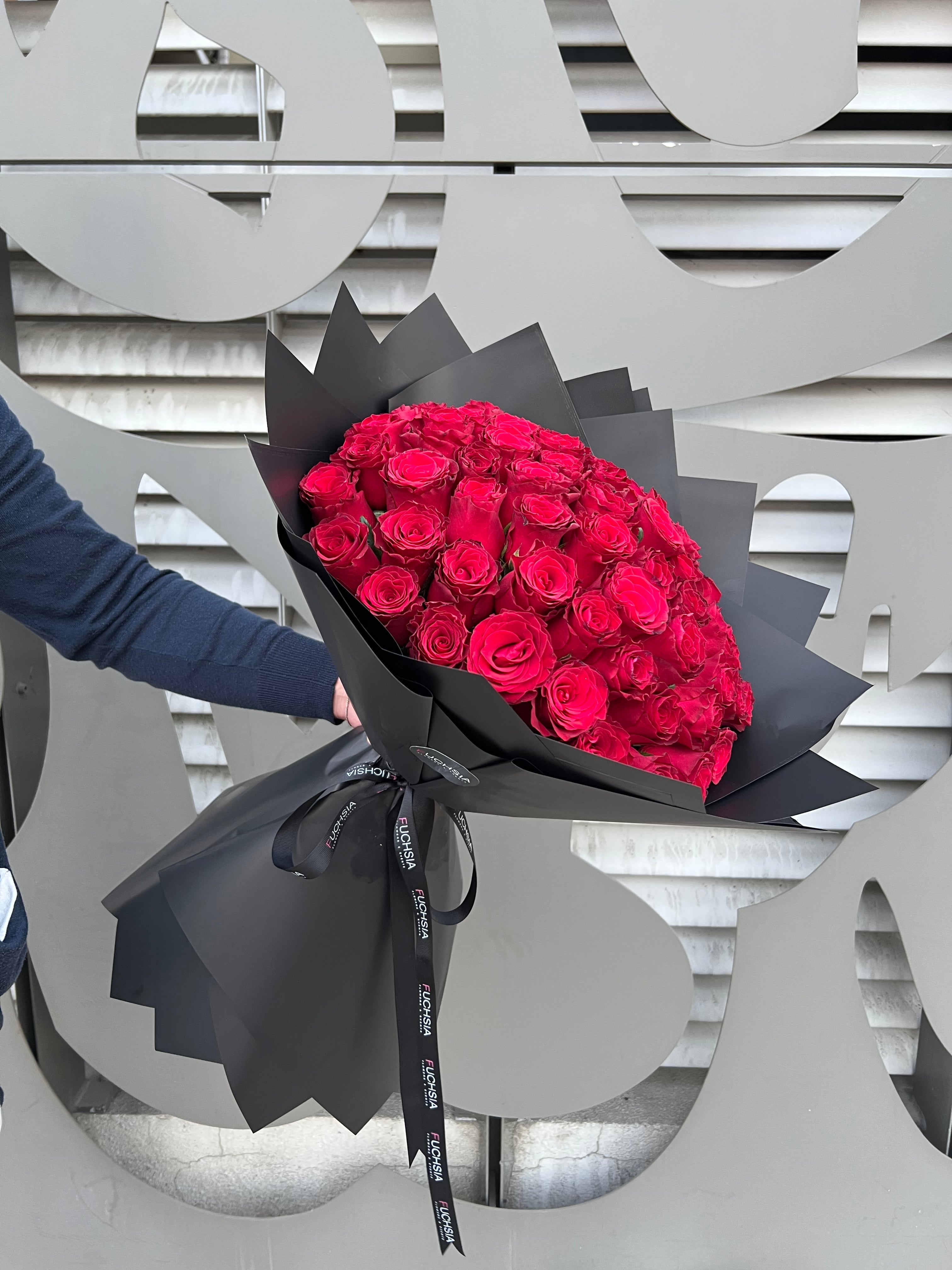 A hand bouquet with 51 long stem and large head red roses in black wrapping, such a bold and elegant choice. It's a perfect combination of passion and sophistication. The contrast between the vibrant red roses and the sleek black wrapping adds a touch of drama and mystery. It's a bouquet that speaks volumes without saying a word.