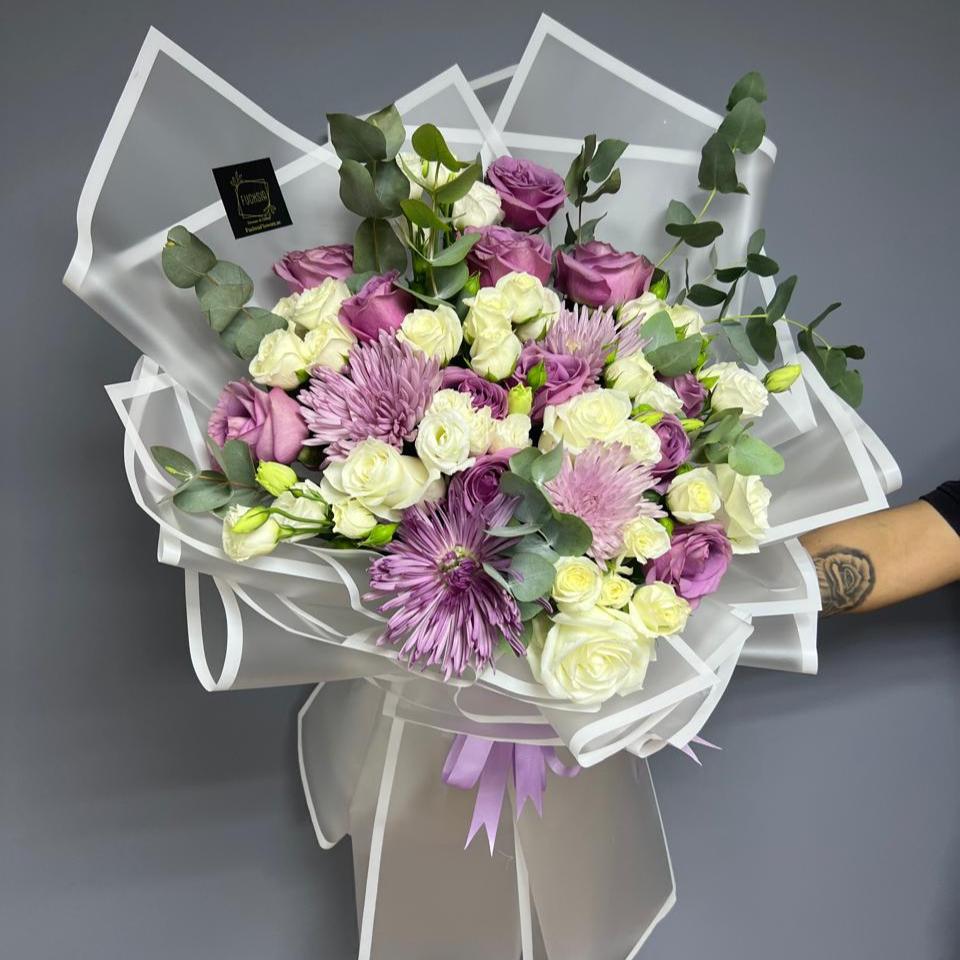 The Royal Purple bouquet is a breathtaking arrangement of white and purple flowers, ideal for any special event or celebration. With its delicate pink roses, crisp white roses, dreamy purple lisianthus, and snowy white chrysanthemums, this bouquet exudes elegance and romance. The addition of lush greenery and a few white blooms provides a touch of contrast, giving the arrangement a sophisticated touch. Whether given as a gift or used as a centerpiece, the Royal Purple bouquet is sure to leave a lasting impression on the recipient.