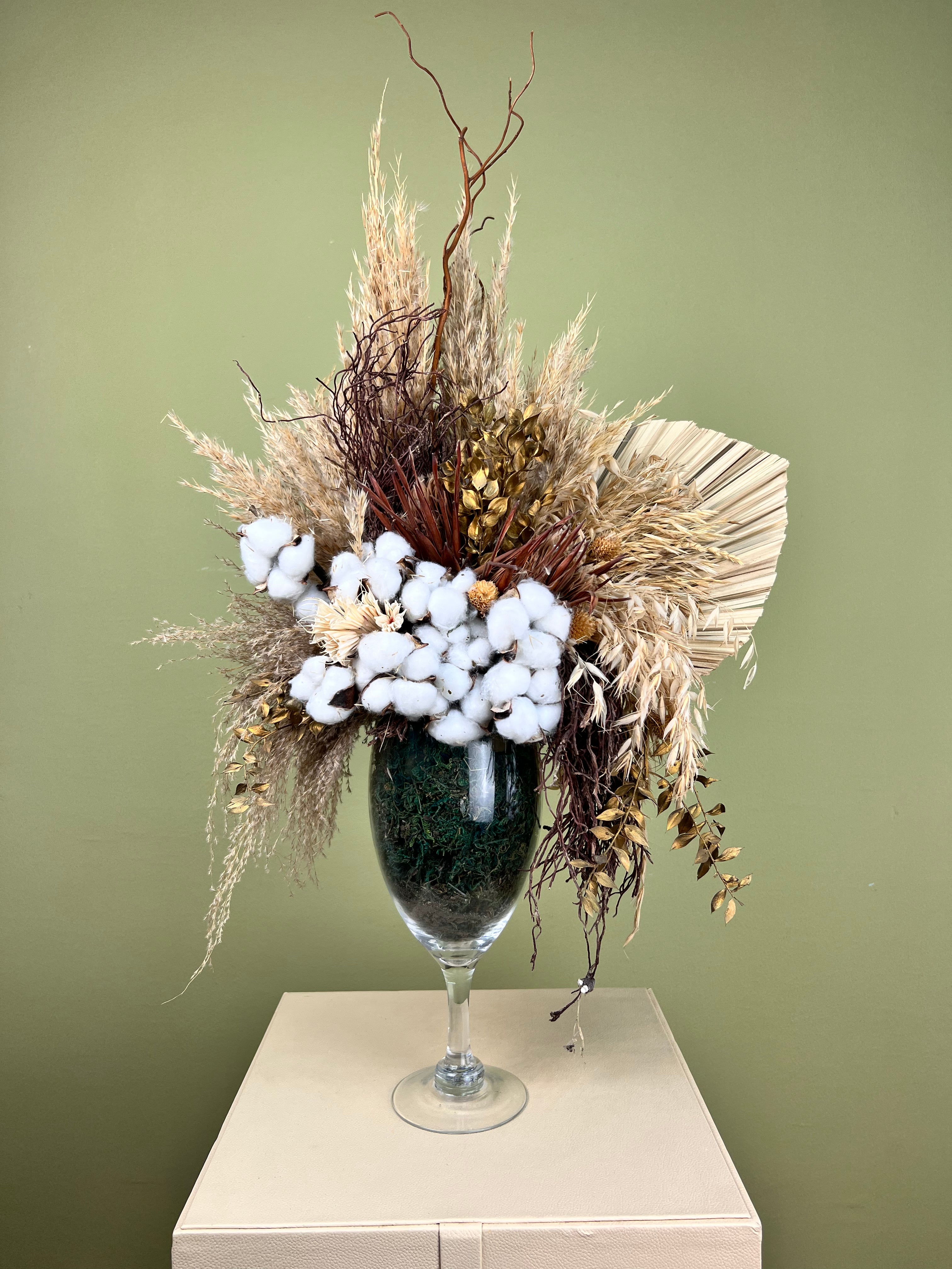 a wine glass filled with dried flowers, grasses, cotton and Salix . The flowers and grasses are all in shades of beige, brown, and white. A simple yet elegant arrangement, perfect for adding a touch of sophistication to any room, office, hall and entrance