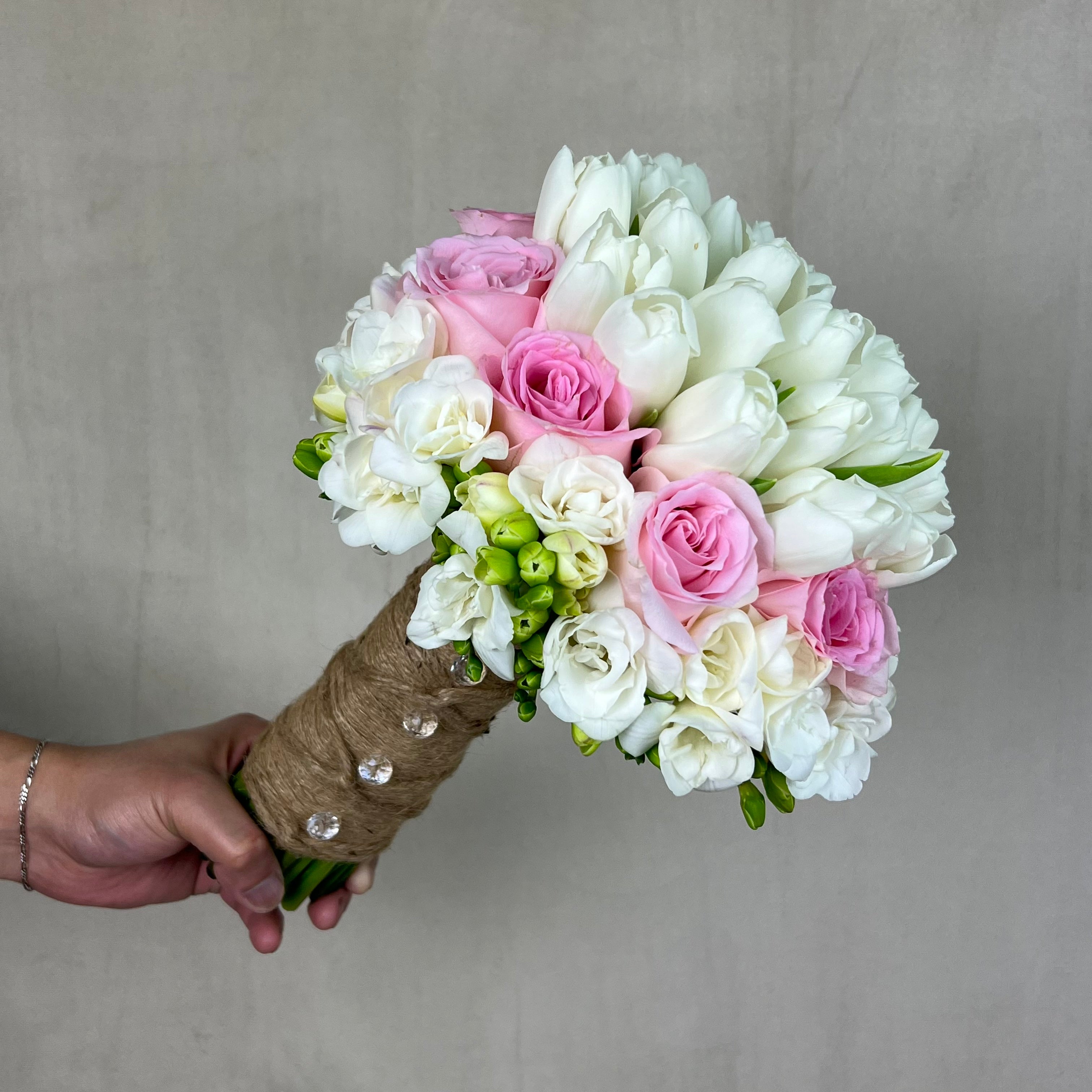 A bridal bouquet of white tulips, pink roses, and white freesia. The bouquet is wrapped in burlap and tied with a ribbon.
