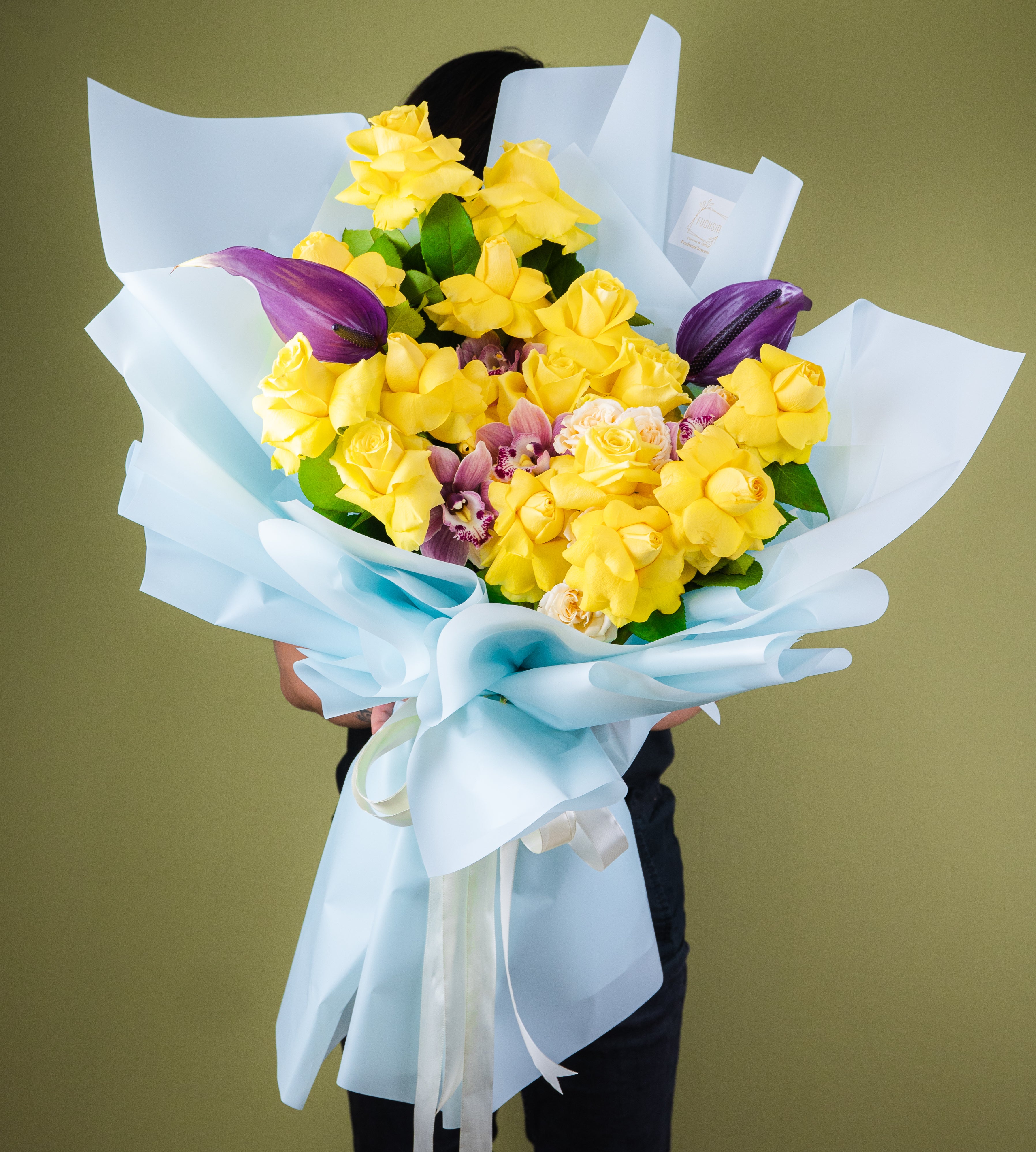 a stunning combination of yellow rose and purple anthurium, radiating the warmth and brightness of sunshine. This unique bouquet is perfect for adding a cheerful touch to any occasion. Delight and impress with its vibrant colors and elegant blooms