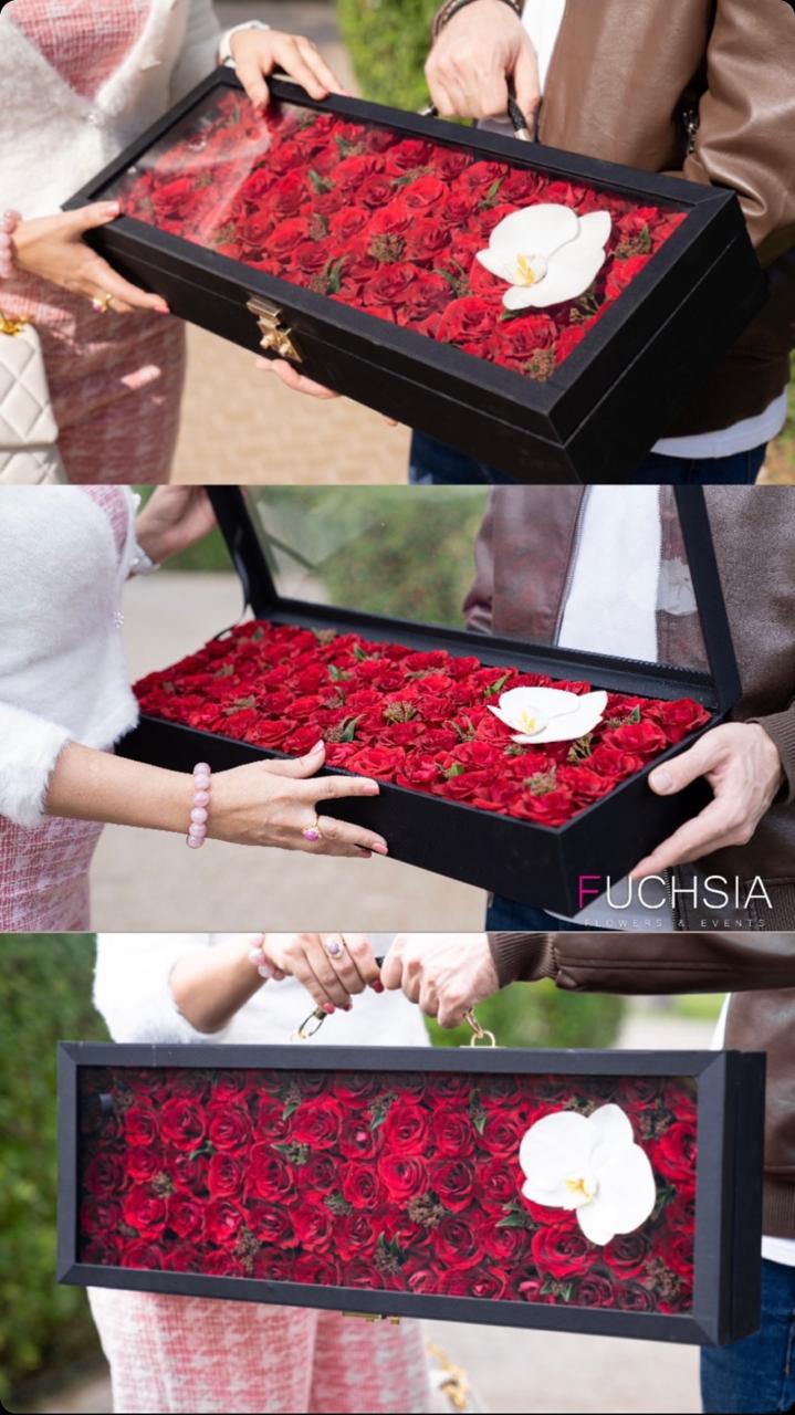 Experience elegance with our Elegant Full Black leather bag. Adorned with a stunning array of Red roses and white orchid this bag exudes sophistication and style. Made with quality leather, it's not only beautiful but also durable. Perfect for adding a touch of class to any occasion .