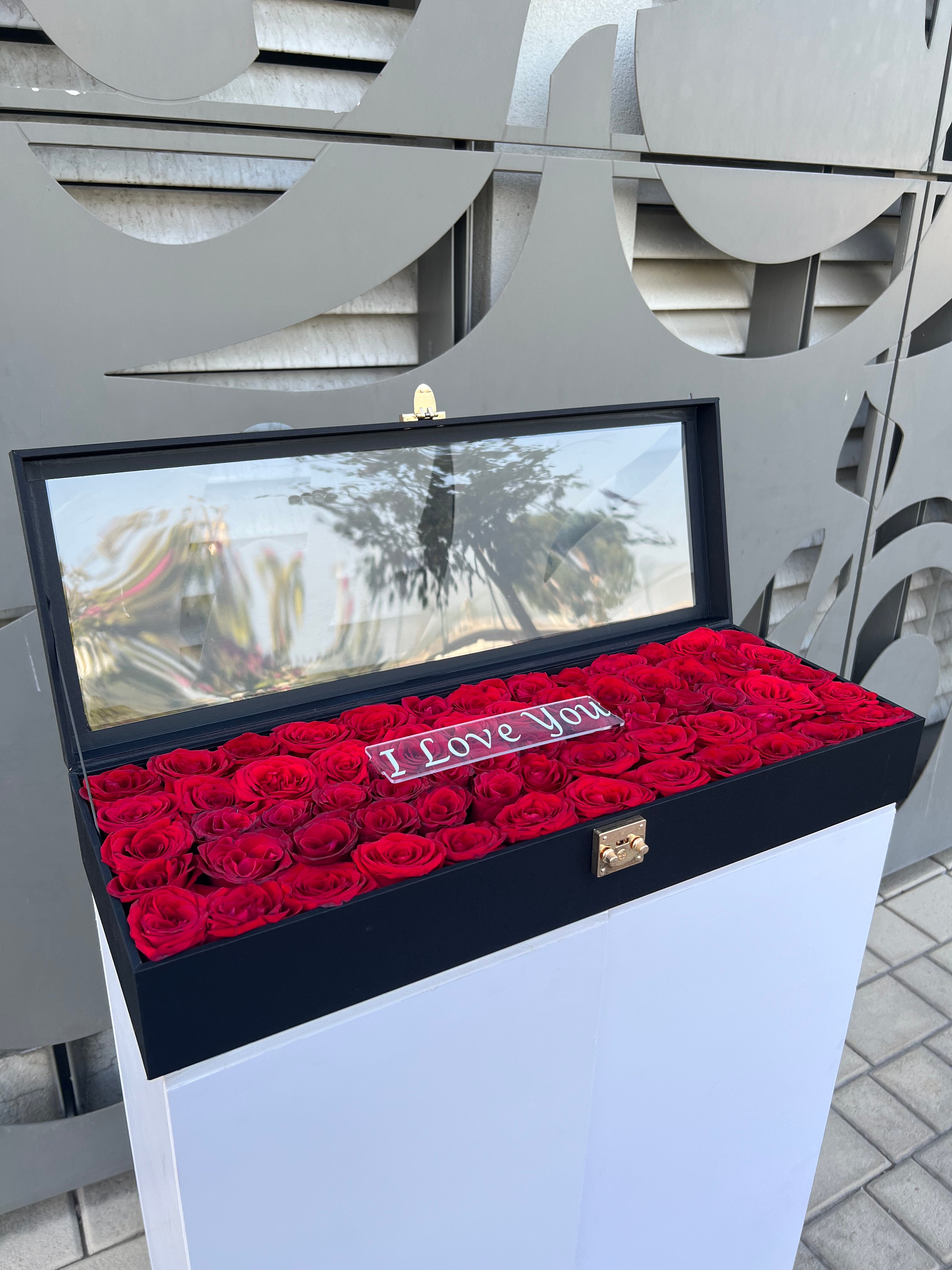 A black box filled with red roses with a clear Acrylic sign that says "I Love You".