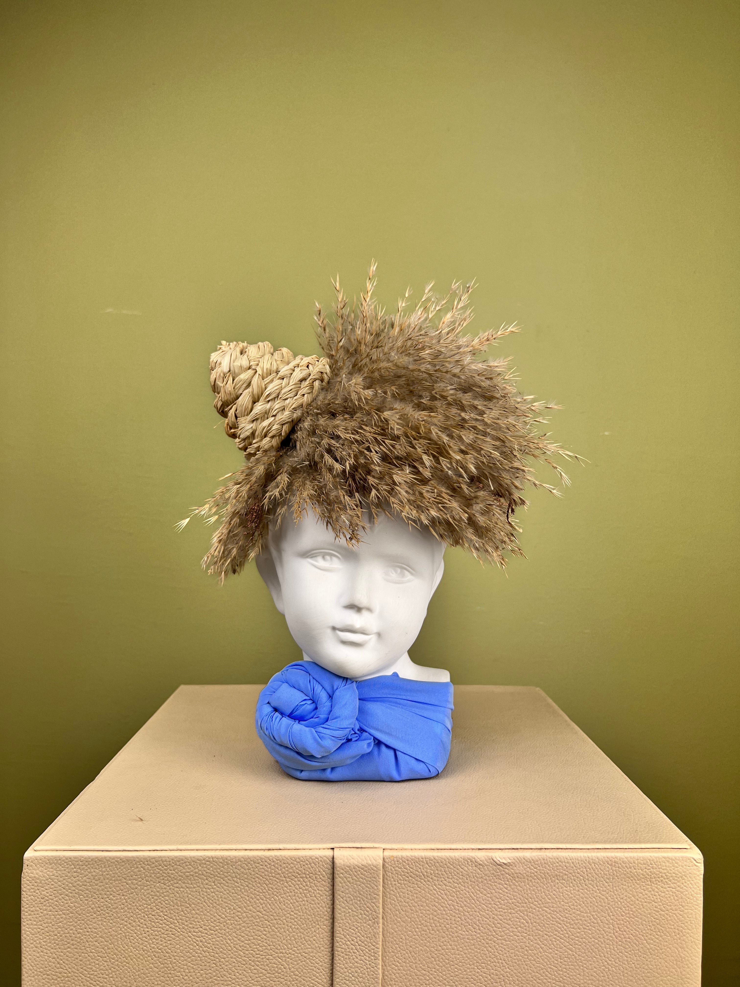 A touch of nature, a touch of whimsy. This beautiful headpiece is made of dried flowers and grasses, including pampas grass and a woven straw ball .